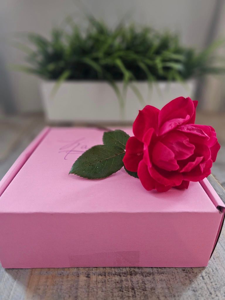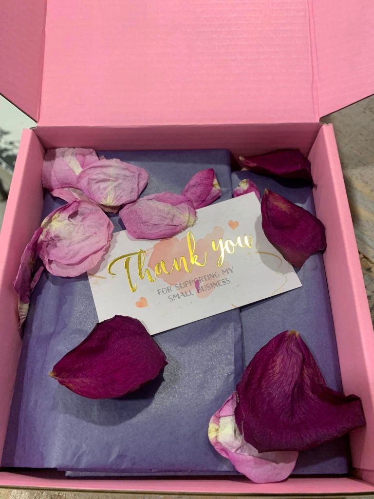 Everything I package now is paper or recycled paper product. I have my signature pink Soap SUDuction box with my stamp on the inside. Plus a piece of purple tissue paper to gather the soaps together, and a thank you card for marketing purposes.“