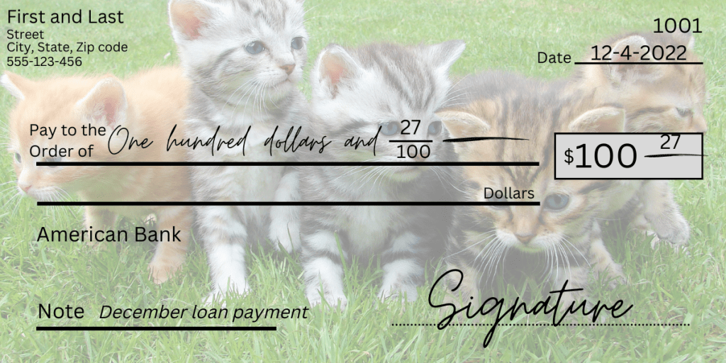 This long line (pay to the order of) is where you write the check amount, but mostly in words. So for example, one hundred dollars, and 27/100. The last part is for change, and it’s best practice to draw a straight line from the change amount to the end of the line (or space you have left on the line).